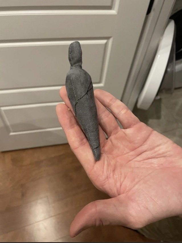 Tucked between a crumpled hoodie and a stray sock: a small, grey object about the size of a carrot. It’s vaguely conical, softly pointed, and wrapped in what looks like a tiny shroud. Not human human—but eerily humanoid in silhouette, like something you’d find in a forest clearing on a true-crime podcast… or a low-budget horror prop from a haunted thrift store.