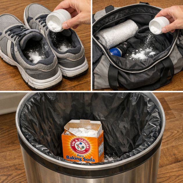 To banish odors from shoes, gym bags, and trash cans, sprinkle baking soda inside and let it sit overnight. Shake out the baking soda or vacuum it up the next day. For trash cans, you can also place an open box of baking soda at the bottom to continuously absorb odors. This method is a simple and inexpensive way to keep these commonly smelly items fresh without using artificial fragrances.